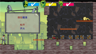 愚蠢僵尸3物理弹射挑战是一款横版策略射击游戏,玩家需运用物理碰撞原理与战术规划能力,通过精准计算弹道路径,操控弹簧子弹在不同建筑结构间形成多重反弹,最终清除场景内所有目标。游戏设计有超过200个特色关卡,每个场景的墙体构造与障碍物排布都经过精心设计,要求玩家通过观察僵尸站位与环境元素,规划出最优射击策略。