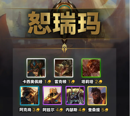 云顶之弈S9赛季恕瑞玛羁绊如何运作?在全新赛季的战术体系中,由卡西奥佩娅、雷克顿、塔莉娅、阿克尚、内瑟斯、阿兹尔及奎桑提七位英雄构成的沙漠帝国阵容,通过太阳圆盘的特殊机制为战局带来颠覆性改变。以下将详细解析该羁绊的核心机制与战略价值。